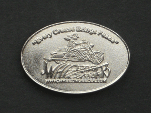 Oval die struck pin. 1.5 inches width x 1 inch height. Silver metal. Wheezin' Geezer logo. Two pin posts and rubber pin keepers.