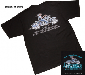 Short sleeve black tee shirt with full color Wheezin' Geezer graphics and catch phrase on back.