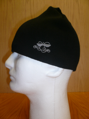 Geezer beannie knit cap - Black with gray logo embroidered Wheezin'Geezer Mustachio logo over left temple.